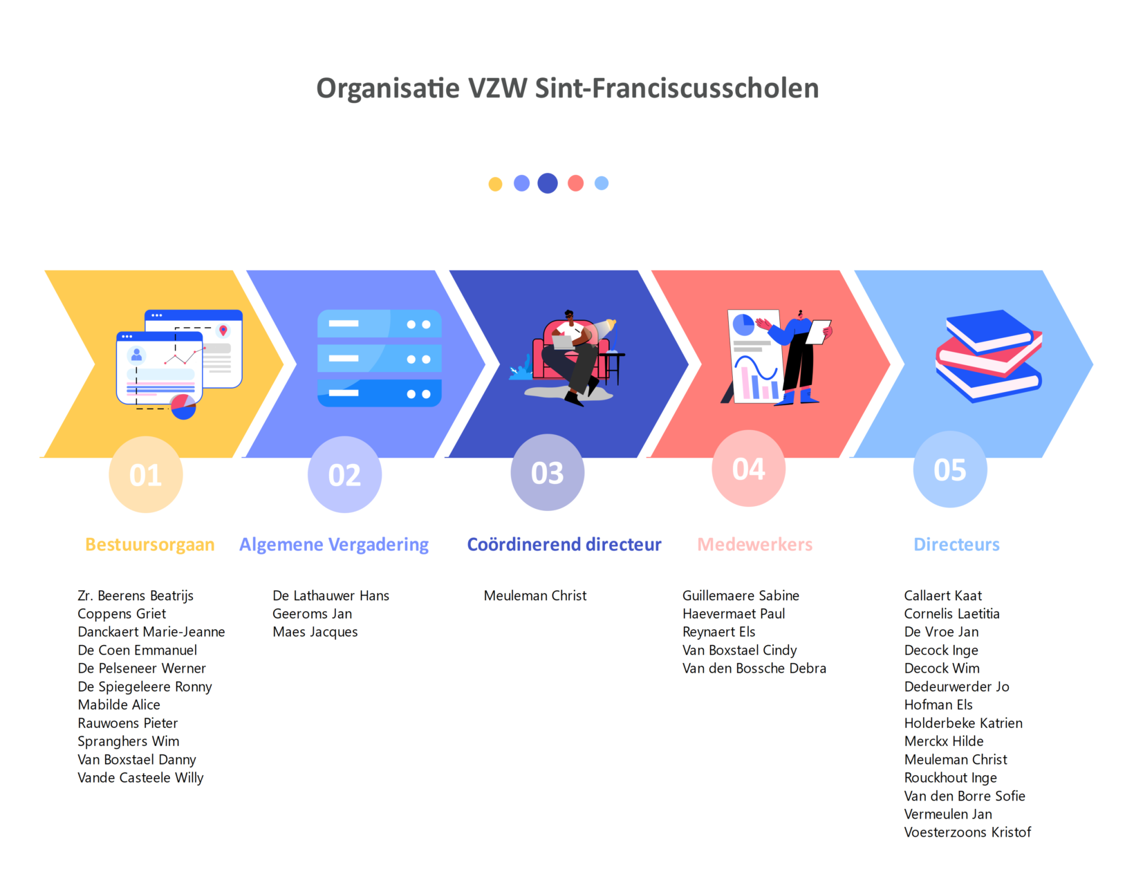 Het schoolbestuur is verantwoordelijk voor het goed functioneren van 13 scholen. Dit doet ze met de hulp van de coördinerende directeur, directies, leerkrachten, ondersteunend personeel,...